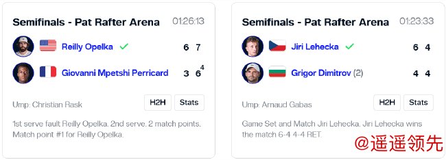 北京时间1月4日晚,2025ATP250布里斯班公开赛结束第九比赛日的争夺。在2场男单半决赛中,卫冕冠军、2号种子迪米特洛夫在先丢一盘、第二盘4-4时退赛,捷克选手莱赫卡收退赛大礼,率先晋级决赛;昨日爆冷淘汰德约科维奇的美国重炮奥佩尔卡2-0战胜法国选手佩里卡德,将与莱赫卡争冠。