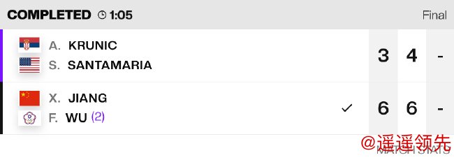在随后进行的女双决赛中,2号种子、海峡组合蒋欣玗/吴芳娴用时1小时05分钟,以6-3/6-4完胜跨国组合克鲁尼奇/桑塔玛利亚,夺得2025赛季中国军团首冠。这是蒋欣玗职业生涯的第4个巡回赛双打头衔,也是吴芳娴的WTA双打第二冠,同时,这还是她俩合作以来首次捧杯。